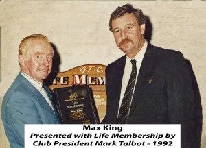 Max started running the boundary in 1946 for the club when he was 12 years old. At that time he filled in for Seniors 18s twice (played if the opposition had more than one team). He played Seniors football in 1950 to 65 starting when he was 16. Unfortunately he broke his hand in 1954 and missed out in playing in a Premiership team. He was Club President from 1959 through to 1965, and also was President of the League in 1964 after being Vice President in 1963. Max received his Life Membership in 1992 in recognition of his service to the club in the 50’s and 60’s Max was later joined as a Life Member by his son Trevor , Daughter in Law Tricia, and Grand Children Stacey & Belinda. Max was also inducted into the clubs Hall of Fame in 2014.