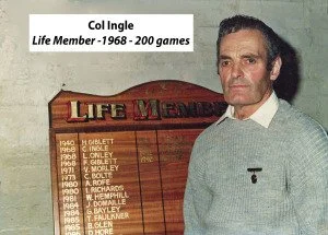 Col played in excess of 300 games between 1954 and 1967 playing in the 1954 Premiership side. Col played as a knock ruckman and although shorter than most used his spring to the advantage of his teammates. Col also possessed amazing aerobic capacity and durability rucking all day and missed very few games. It came out afterwards that Col was a professional runner who competed in the Stawell Easter Carnival. On one occasion Col turned up at a game with a broken wrist in plaster but still played after the umpires made him cover the plaster with padding. Remembered as a quiet bloke and a great clubman, Col was granted his Life Membership in 1968.