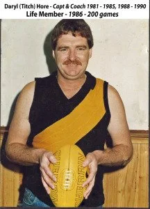 Titch’s significant career started in the Thirds at Gormandale in 1971 and he quickly made himself a regular Senior player until 1975 when he tried his luck at Traralgon. In 1979 he returned to the club as Senior Assistant Coach and in 1981 became the Senior playing Coach a position he held until 1986. In that period the Seniors were runner up in 1981 before breaking a 28 year Premiership drought in 1982. Playing under Neil Meredith in 1986 and 1987 he was a key player at Centre Half Back in the famous Neave, Hore, Parker half back line in the 1986 Premiers and Champions team. After reaching his 200 games in 1986 he was awarded a Club Life Membership. Titch resumed his Coaching career in 1988 in a non-playing capacity which produced a Senior Premiership in 1989 before his coaching at Gormandale finished in 1990. Titch also coached the League Interleague teams in the late 80’s and was bestowed the honour of a League Life Membership in 1990. Titch also had a total of 14 seasons through to 2014 as a Committee Member and has done a number of roles including Vice President, Team Manager, Football Jumper washer, and nowadays is a key member of the Clubs Chook Auction crew. It was a worthy reward for Titch in 2014 when he was inducted into the clubs Hall of Fame and along with Bill Onley was made a Legend of the Club.
