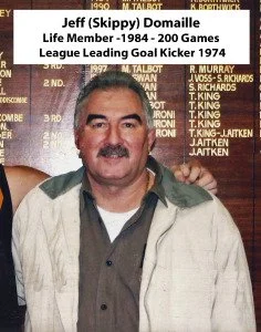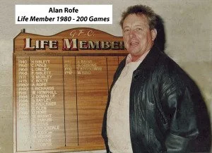 Rofee as he was affectionately known, was a little rover who first started playing with the club in the late 66’s with his 200th club game and subsequent Life Membership awarded in 1980. Rofee was renowned for getting under the skin of his opponents with his cheek, but was a great exponent of the stab kick and later in his career the drop punt. Full forwards such as Peter “Pud” North and Jeff “Skippy” Domaille would lead to Rofee when he had the ball knowing he would hit there chest with his pass. When Rofee's playing career finished he had played about 260 games for the club with over 200 of those in the Senior team. Rofee took up running for the club after finishing as a player, and did the running for the 1982 Senior Premiership team and the 1981 & 83 Reserve Premiership teams.