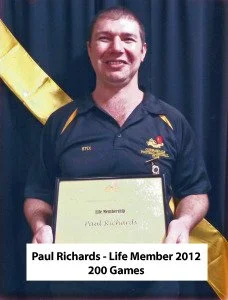 A Gormandale kid Sticks played his Junior Football and the first part of his Senior career with Traralgon before coming out to the club as assistant coach in 1998 under Mark Stockdale. He was also assistant coach in 1999 before spending a year with Fish Creek, returning again as assistant coach from 2001 to 2006 and had a year as playing A coach in 2012. A magnificent mark and kick he played most of his 200 plus games at full forward winning the clubs goal kicking award a record 10 times between 1998 and 2010. He was also the North Gippsland Leading Goal Kicker in 2005, 2006, 2007, & 2010, and was the clubs runner up Best & Fairest in 1998 & 2001. Sticks regularly attends games with a daughter playing netball at the club, and helps the club out from time to time off the field. Sticks was awarded a Life Membership in 2012 on reaching his 200 games, joining his father Dusty as a Life Member, and was inducted into the clubs Hall of Fame in 2014.
