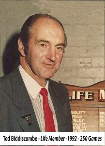 A Gormandale local Ted played in excess of 250 games between 1957 & 1972 with the exception of the 67 & 68 seasons when he Coached in Tasmania. Playing mostly at Centre Half Back, Ted won the Club Best & Fairest in 1959 and shared it in 1961, a year where he played the whole season at Full Back. Ted was disappointed in the umpires in 1961 as he only received one vote in the League Best & Fairest. After retiring from playing Ted helped the club by Goal Umpiring the Reserves from 1973 to 1976 when he and his family moved from Gormandale. Story has it that Goal Umpire Biddiscombe often gave a young Full Back by the name of Titch Hore some tips during the game. The Club recognised Teds service with a Life Membership in 1992