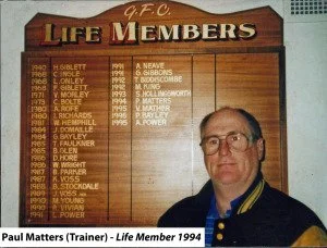 In 1995 Vic received his Life Membership of the club joining other members of his training group in Geoff Gibbons and Paul Matters with that honour. Vic’s history with the club goes back to 1981 and he was a pictured in the clubs last Senior Premiership team in 1995. Vic had a few years away from the club in the Mid 80’s, but his service as a Trainer was exceptional and he was highly regarded by the players for his knowledge and expertise in the player treatment area.